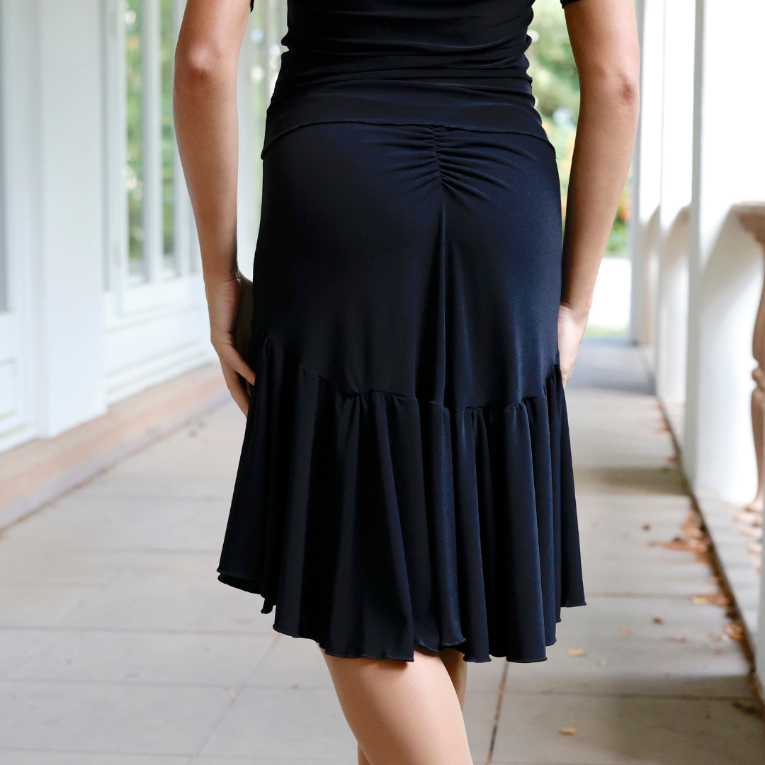 Der GAZA Latino Rock vereint Stil und Bewegungsfreiheit in einem eleganten Design. Der breite, glatte Taillenbund sorgt für optimalen Sitz, während die Raffung in der Mitte des oberen Rockteils besonders auf der Rückseite einen schönen Effekt erzeugt.